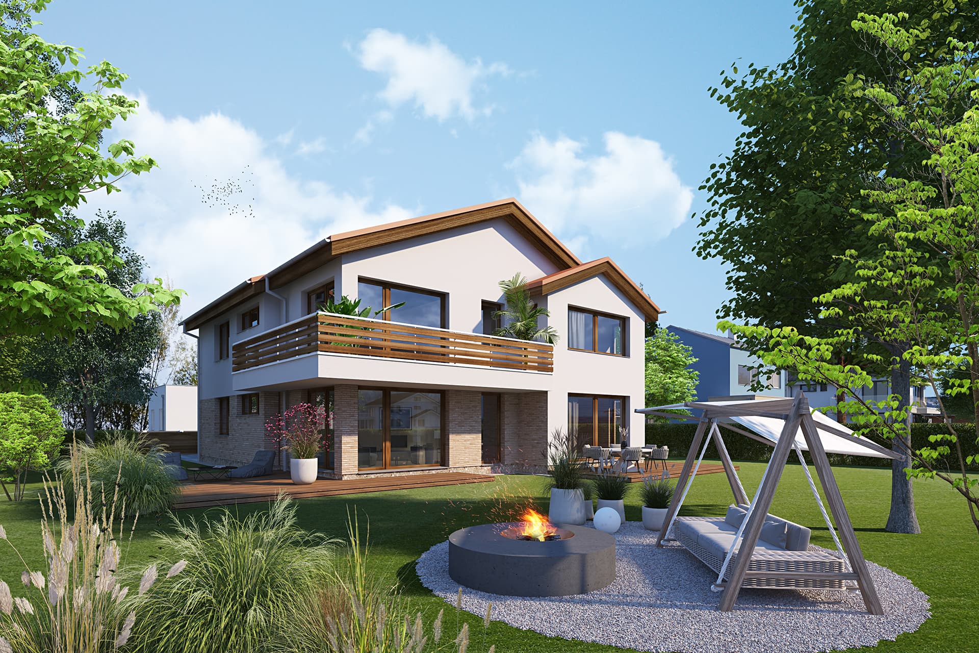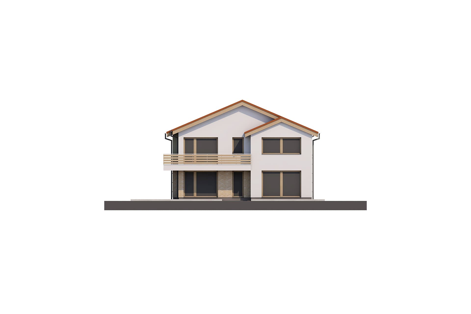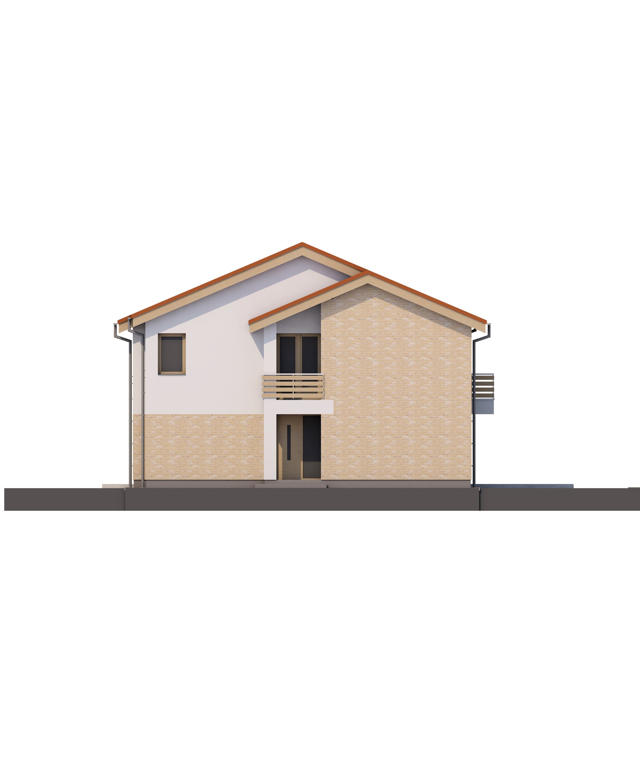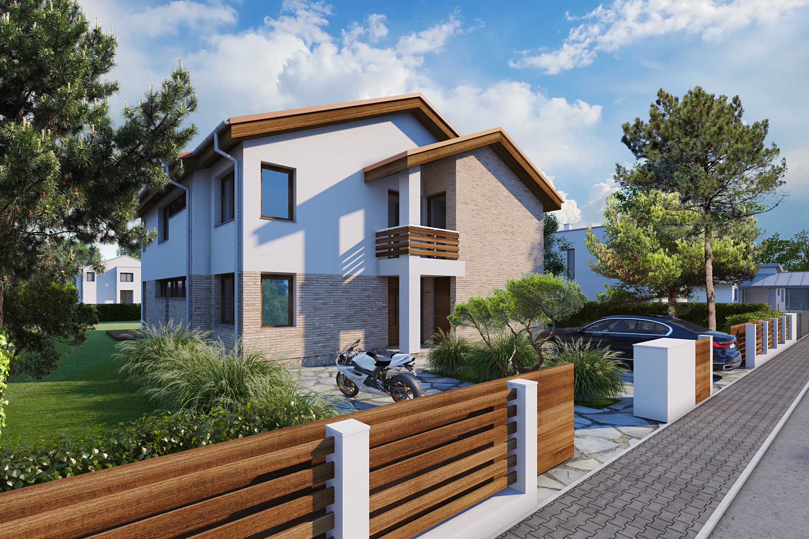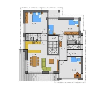 Typový projekt nabízí kombinaci tří bytů, dvou bytů 2+kk a jednoho 4+kk. V přízemí domu se nachází společná technická místnost pro celý rodinný dům, a centrální hala se schodištěm do 2.NP. Dále jsou v přízemí dva byty 2+kk, každý má výstup na zahradu na jiné fasádě pro lepší komfort obyvatel. Třetí byt 4+kk se nachází v horním patře a má k dispozici balkón, orientovaný na dvě strany fasády domu. Fasáda domu je navržena v kombinaci lícového zdiva, klasické fasády a výrazných dřevěných prvků na šikmé sedlové střeše.