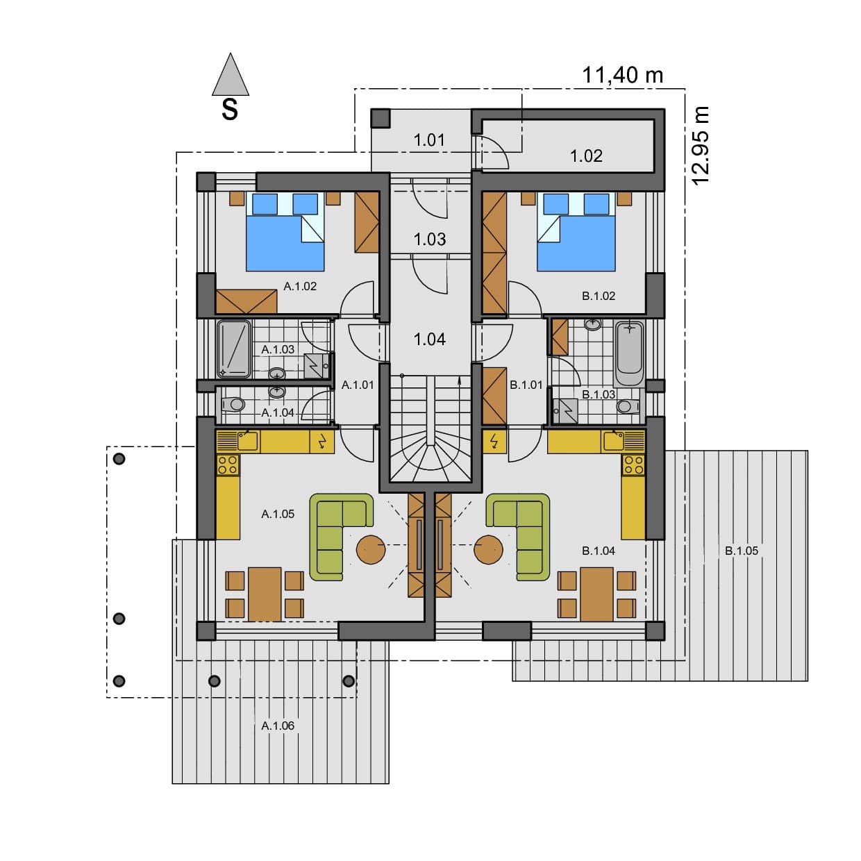 Jedná se o malý kompaktní rodinný dům se sedlovou střechou, který ovšem nabízí více bytů než se může na první pohled zdát. V přízemí rodinného domu se nachází dva byty s dispozicí 2+kk, společná technická místnost a vstupní hala se schodištěm do druhého patra. V něm najdete prostorný byt 4+kk s terasou a dvěma koupelnami.