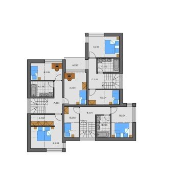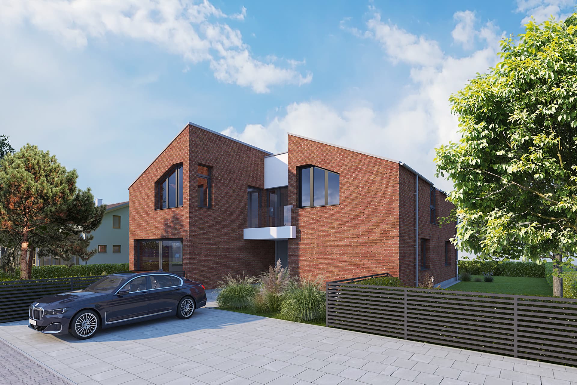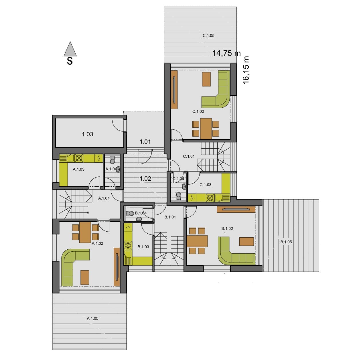 Tento typový projekt rodinného domu s více byty vznikl s vizí, aby byl každý byt propojen se zahradou. Toho je docíleno specifickou hmotou domu, kdy jsou jednotlivé byty pootočeny o 90°. Ve středové části domu se nachází společná hala, přes kterou jsou jednotlivé byty přístupné. V přízemí se nachází vždy obývací pokoj a oddělená kuchyně a WC. Po schodech se vstupuje do podkroví, kde ne u dvou bytů nachází dvě ložnice a koupena, u třetího bytu je to jednu ložnici více. Podkroví je dostatečně prosvětleno dostatečným návrhem střešních oken. Rodinný dům má moderní vzhled, nejen díky obkladu z lícového zdiva, ale také díky pultové střeše bez přesahu.