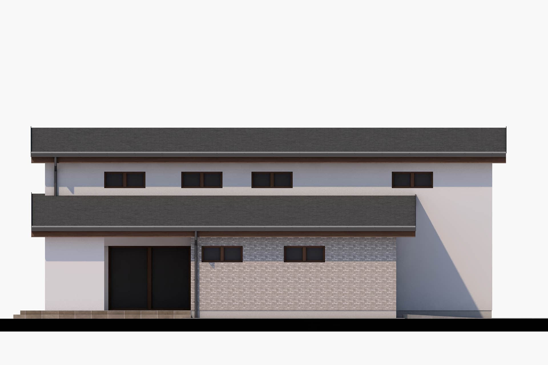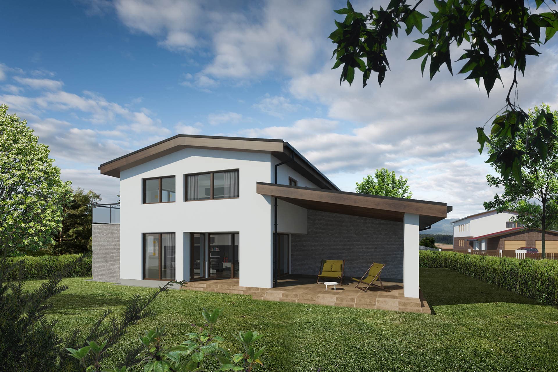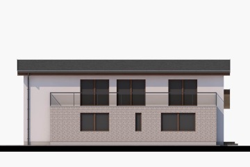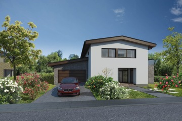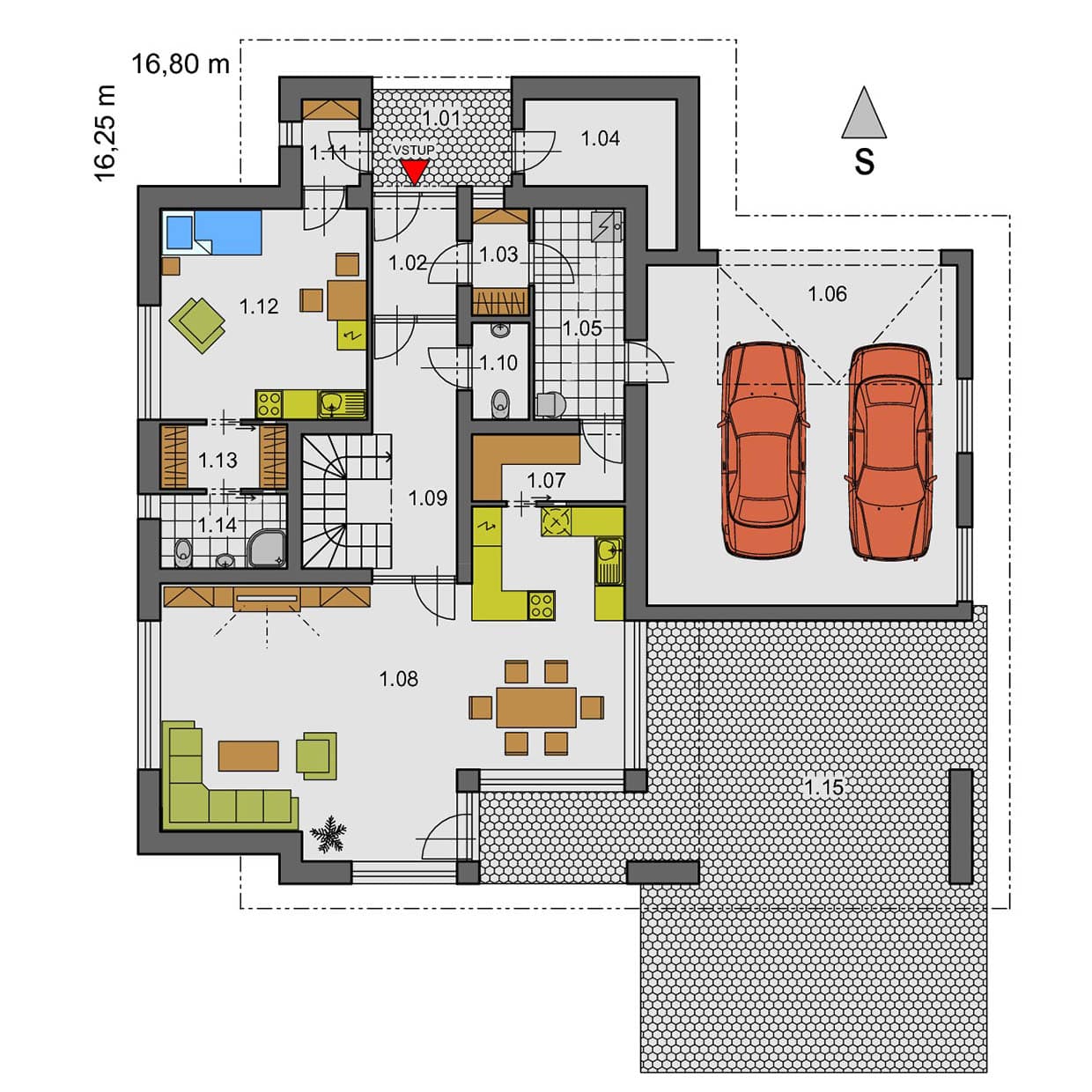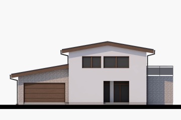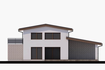 Projekt rodinného dvougeneračního patrového rodinného domu. Projekt rodinného dvougeneračního patrového rodinného domu. Z krytého závětří máme možnost vstoupit do prostoru, který je uvažován k využití např. jako kolárna, dále pak do zádveří garsoniéry, ke které dále přiléhá šatna a koupelna s WC. Hlavním vstupem se dostaneme do zádveří hlavní části rodinného domu s dispozicí 5+kk. Možnost máme vstoupit do hlavní haly se schodištěm do patra nebo přes šatnu do technické místnosti. Ta je propojena s dvougaráží a spíží průchozí přímo do kuchyňského koutu propojeného s obývacím pokojem. Z obývacího pokoje je výstup na prostornou krytou terasu nacházející se za dvougaráží.