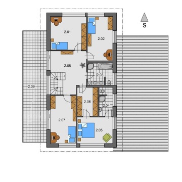 V patře rodinného domu jsou prostornou halou propojeny tři pokoje, koupelna s WC a přes průchozí šatnu se vstupuje do ložnice rodičů s vlastní koulenou a WC. Celý rodinný dům je zastřešený sedlovou střecho s přesahem a mírným sklonem.