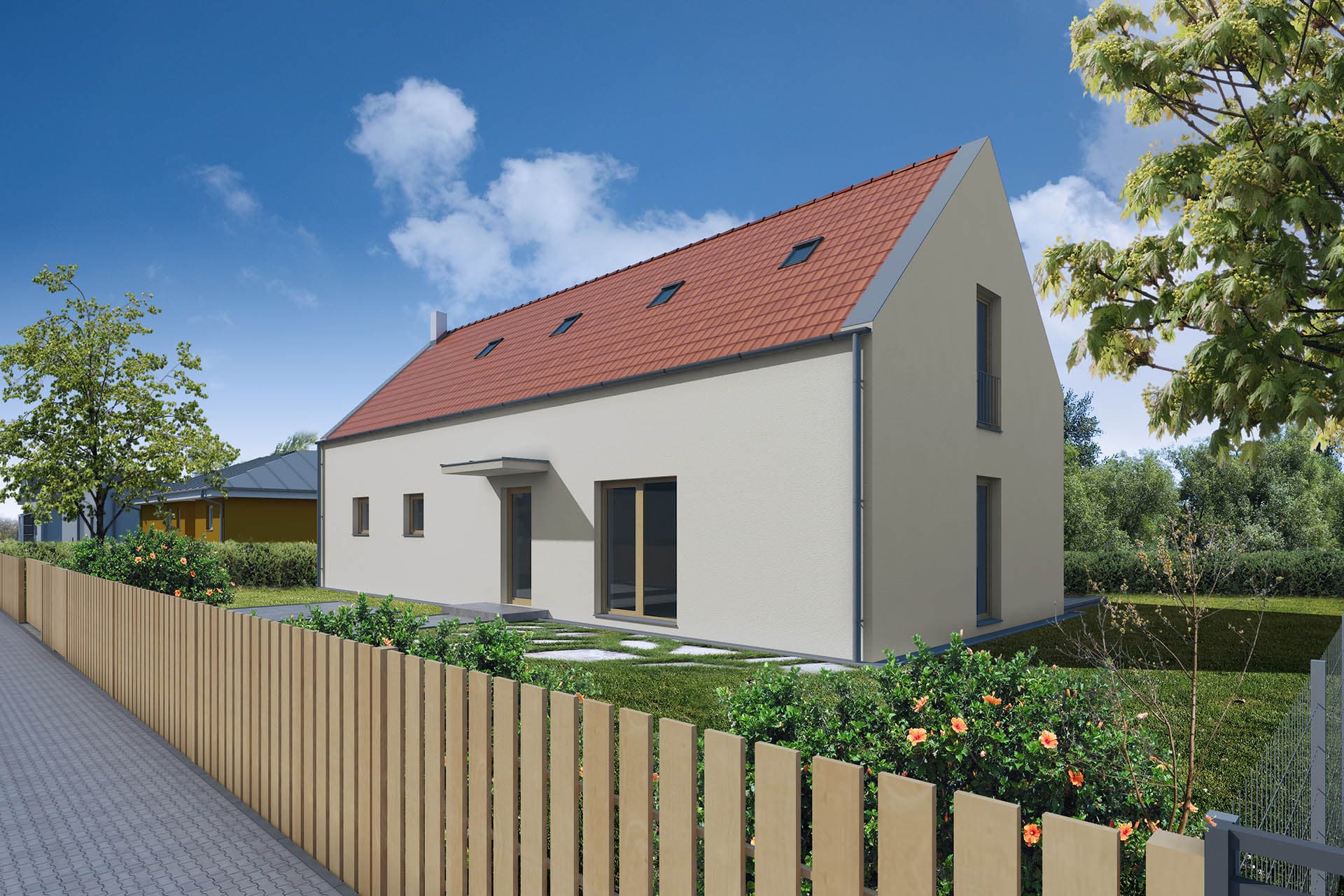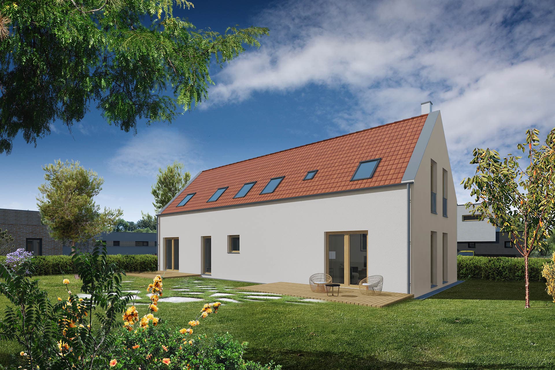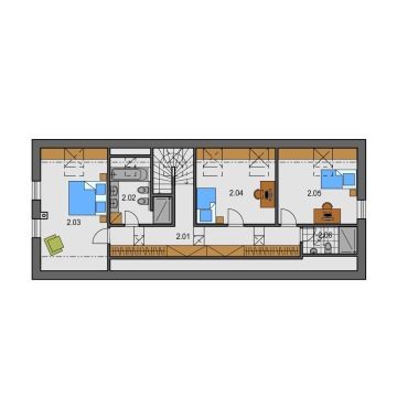 Typový projekt Viktorie 1.01 ukrývá zajímavou dispozici se dvěma byty s dispozicí. V přízemí domu nabízí 2+kk byt a v druhé polovině a v patře byt 4+kk. Dům má jeden vstup, ze zádveří se pak vstupuje do jednotlivých bytů, ty jsou od sebe odděleny akustickou příčkou, aby byl zajištěn dostatečný komfort. Menší z bytů nabídne k užívání ložnici pro dvě osoby, koupelnu s WC a obývací pokoj spojený s kuchyňským koutem. Druhý byt disponuje v přízemí samostatným WC, technickou místností a obývacím pokojem s kuchyní. V patře jsou tři ložnice a dvě kouleny s WC. Horní chodba nabízí ideální prostor k umístění vestavěného nábytku a je ideálně osvětlena střešními okny. Celý rodinný dům, přestože nabízí dva byty, tvoří kompaktní obdélníková hmota se sedlovou střechou, na štítech bez přesahu, podélně s malým přesahem. Všechny pokoje v přízemí jsou propojeny se zahradou francouzskými okny. Francouzská okna jsou i ve štítech v patře.