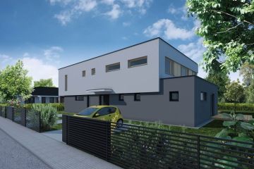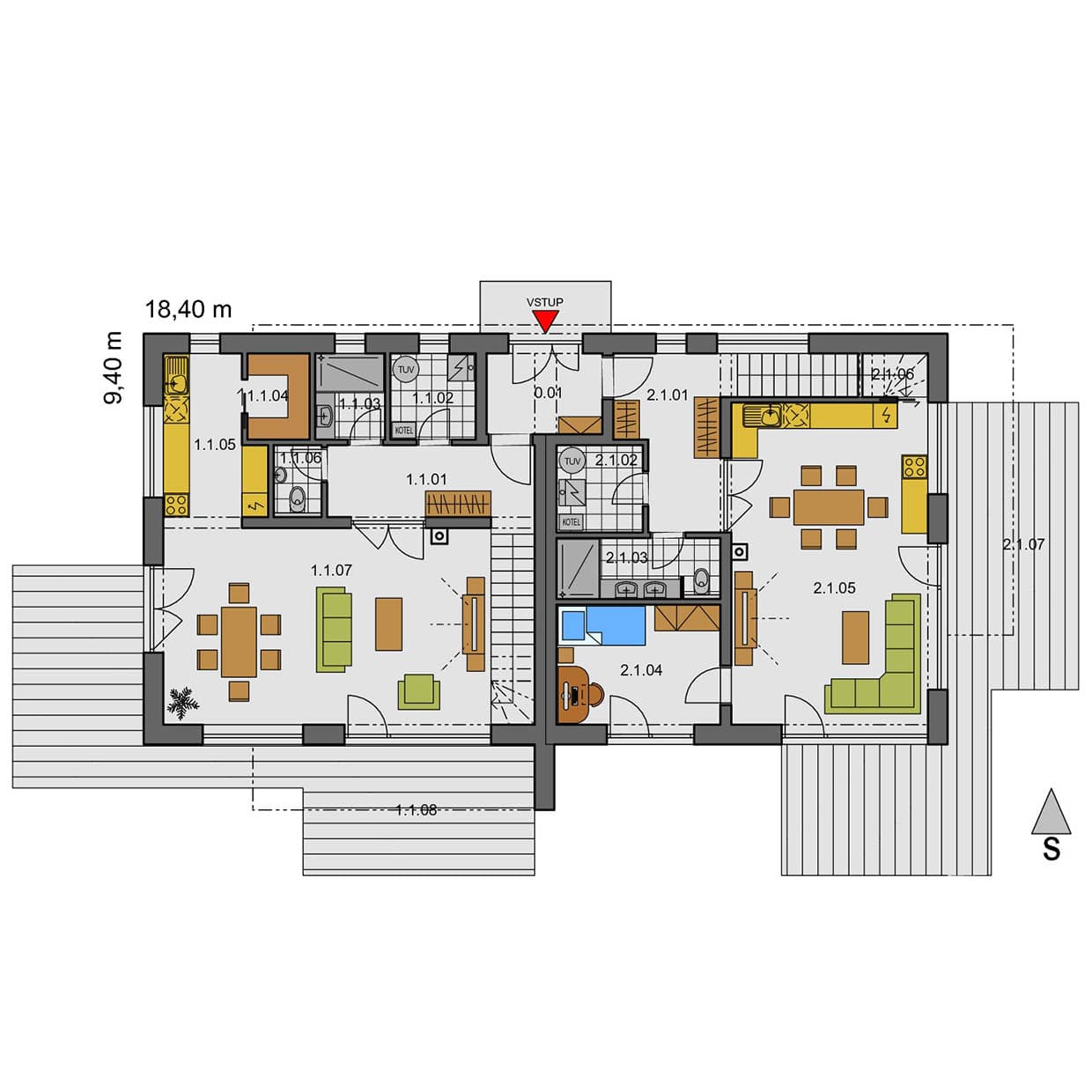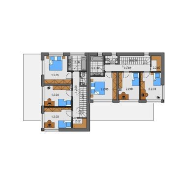 Typový projekt rodinného domu Viktorie 2.01 nabízí spojení dvou bytů dispozic 5+kk a 4+kk v jednom kompaktním moderním řešení s plochou střechou. Rodinný dům má jeden vstup, ze zádveří se pak vstupuje do jednotlivých bytů. Větší byt má v přízemí kromě, kuchyňského koutu s obývacím pokojem, koupelny WC a technické místnosti ještě pokoj pro hosty. Z obývacího pokoje a jídelny je pak propojení a výstup na zahradu ze dvou stran domu. V podkroví se pak u obou bytů nachází klidová část se třemi ložnicemi, samostatným WC, šatnou a koupelnou. Půdorysný tvar domu v přízemí tvoří obdélník, patro má pak tvar písmene L, což na celkové hmotě domu vytváří různorodý tvar. Celý rodinný dům je bohatě prosvětlen přes prosklené čísti fasády.